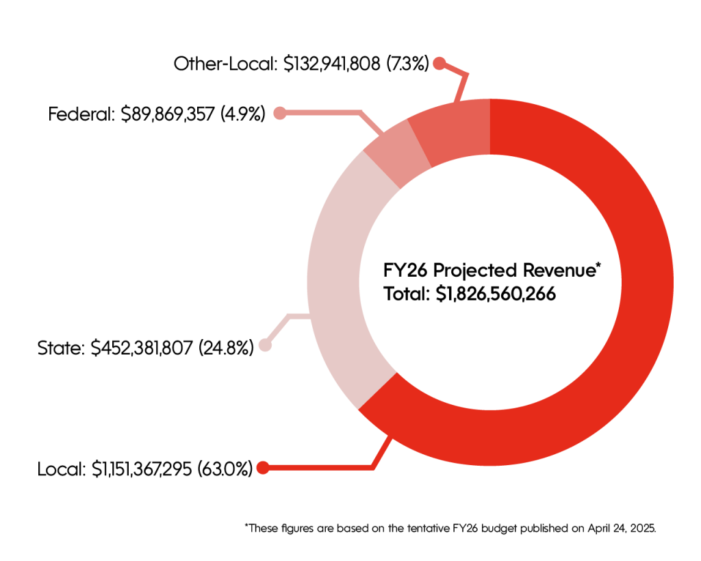 For FY 26, FCS projects that revenue from all four sources will total $1,826,560,266. Below is an illustration showing the total projected amount of revenue per source.